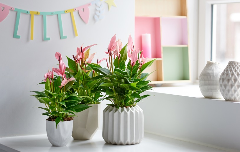 The Anthurium is one of the few flowering houseplants to produce flowers continuously all year round. Anthurium flowers come in many colours, such as the familiar red, white and pink varieties, but also purple, green and brown. The Anthurium is not only beautiful, but also easy to care for and thereby one of the few flowering houseplants that are suitable for use in an office.