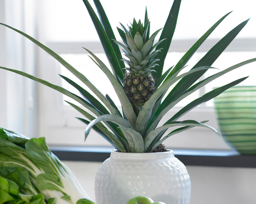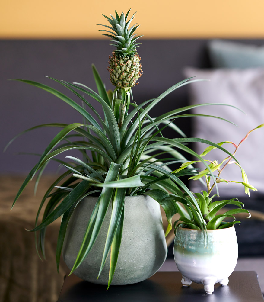 This is the pineapple as an ornamental plant. The fruit are a lot smaller, and look like a mini-pineapple growing on a bromeliad. The colour is also a few shades darker. It’s not grown for consumption, but if you are lucky and wait until the fruit turns reddish orange, you could try a nibble.
