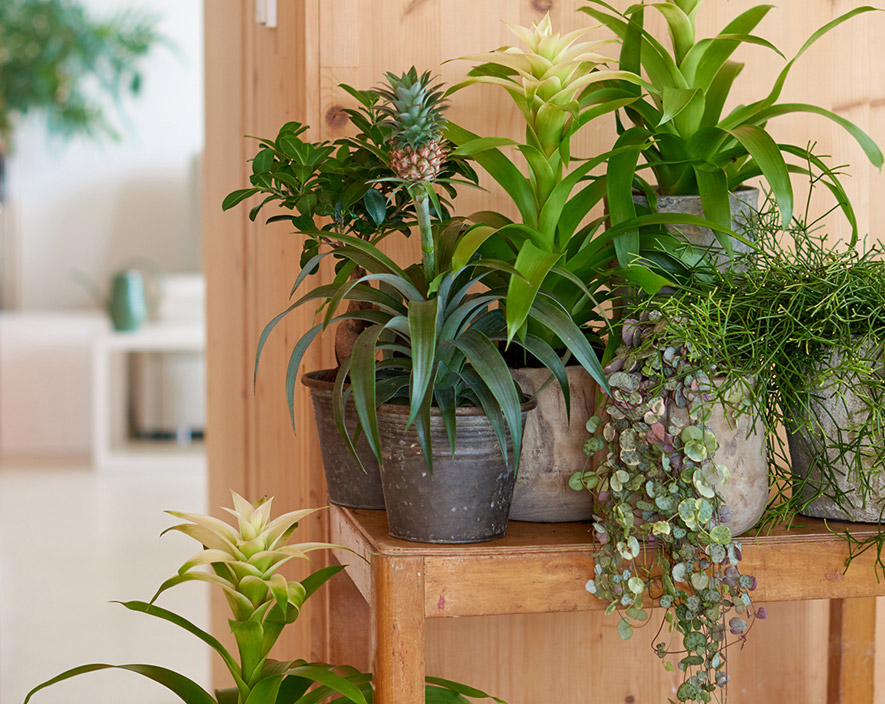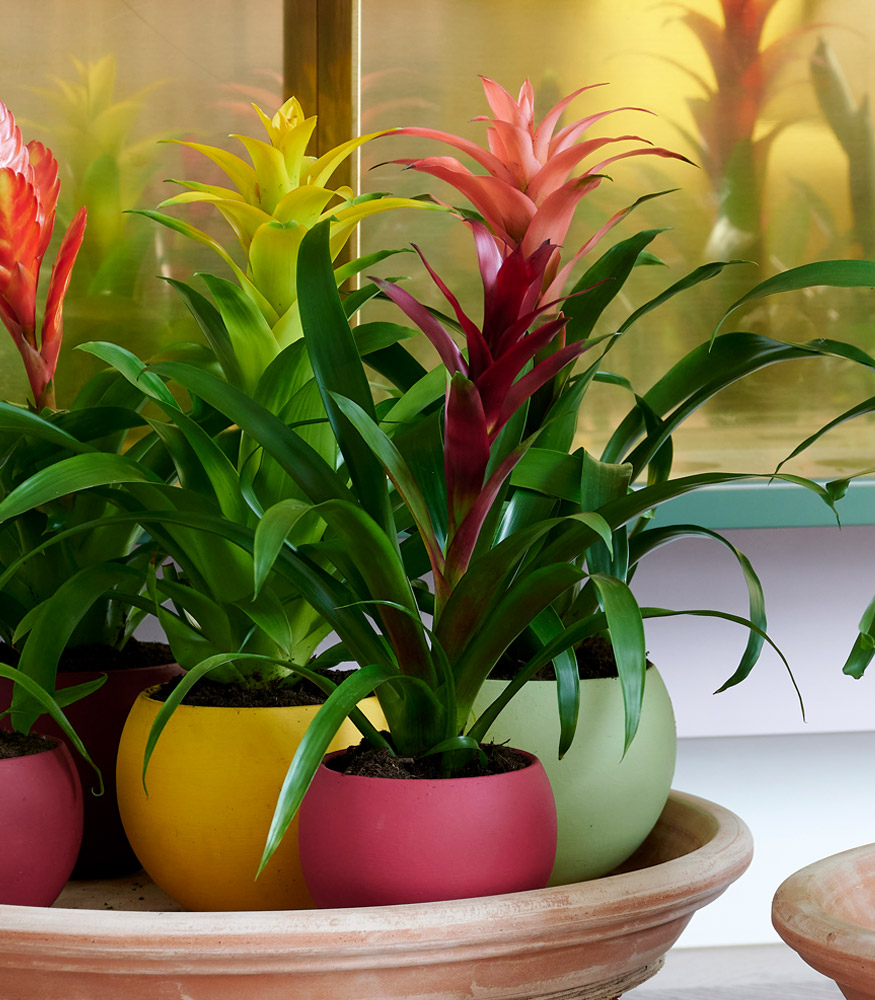 Get things sparkling in store by combining bromeliads with vivid colours, stripes and patterns. If you want to keep things a bit more muted and calm, use only the same plants.