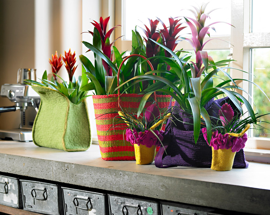 For a natural style, the trick lies in letting bromeliads blend into an interior as much as possible. Have them emerge from crochetwork, use them to make a cheerful wall, combine them with wicker or have them blend into a collage. Bromeliads can take a lot without being overwhelmed.