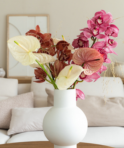 Anthuriums are also available in smaller sizes, these are called Lovely's. The diameter of this flower is 7 to 8 centimetres, and its stem length is 40 to 45 centimetres. This size makes it really eye-catching and easy to work with. In addition to smaller sizes, there are also larger sizes. Examples include the tulip-shaped Marea, the raspberry Impulz or the white-green Denali.