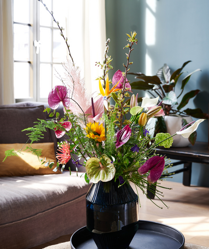 A cliché, but true; it is impossible not to feel cheerful when you see the Anthurium. This beautiful cut flower brightens up any interior with its colourful spathes. Its exotic appearance gives it away; Anthuriums originally come from the rainforests of Colombia. They are grown in greenhouses throughout the Netherlands and are available year-round. The flower can last three to four weeks if the stem is regularly cut at an angle.