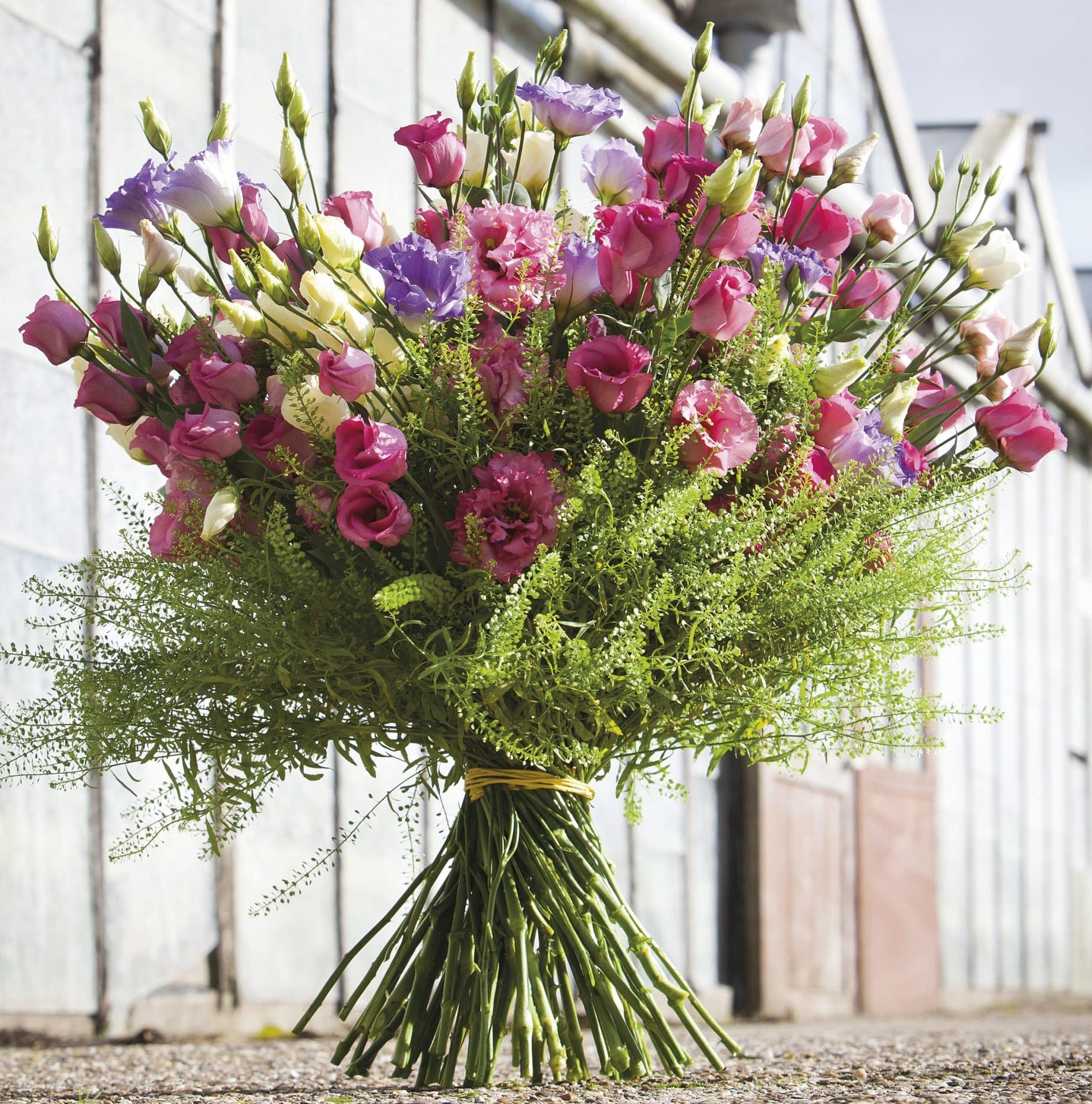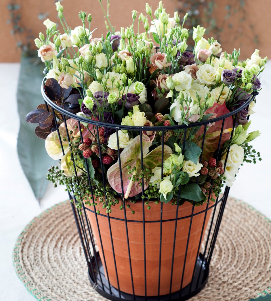 These cheerful flowers are easy to combine with other blooms. Lisianthus offers a host of possibilities. Create a full bouquet with rosehips, anthurium, Cotinum and blackberries. Place it in a rugged terracotta pot with subtle lines. Soft colours create a romantic picture. The flowers appear to be trapped in a loving bouquet.