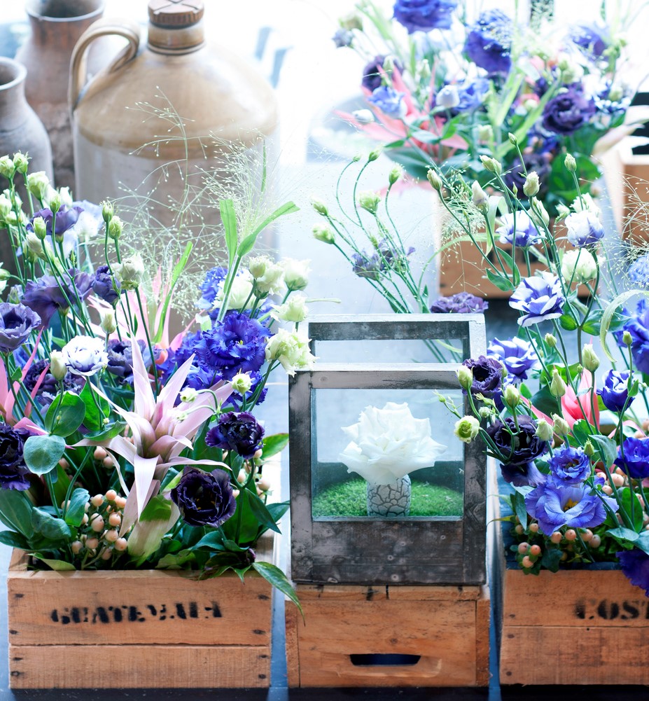Or place several small crates together and fill them with lisianthus together with Panicum, Hypericum and Bromelia. That creates a powerful look for your customers whilst still retaining this flower’s tenderness.